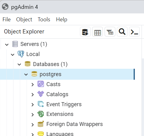Fifth, click on the Servers node to expand the server. By default, PostgreSQL has a database named postgres: